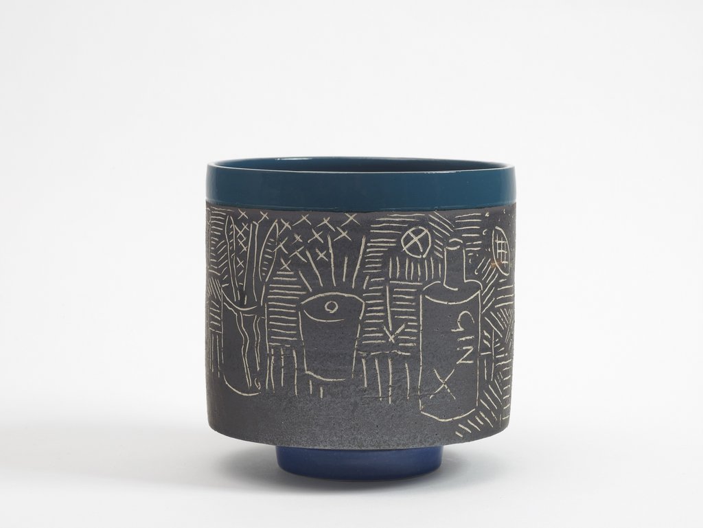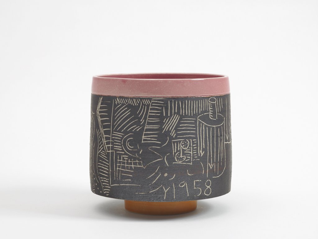 These thrown forms act as blank surfaces onto which The Grantchester Pottery scratched designs using the process of sgraffito – a traditional form of ceramic decoration.The scratched designs are composited from travel photographs of landscapes, interiors and the artists' studios, with recurring motifs such as eyes, flowers, bottles of gin, and lemons. They also reference designs by Hammer Prints, such as ‘Bark Cloth’ and ‘Sgraffito’.